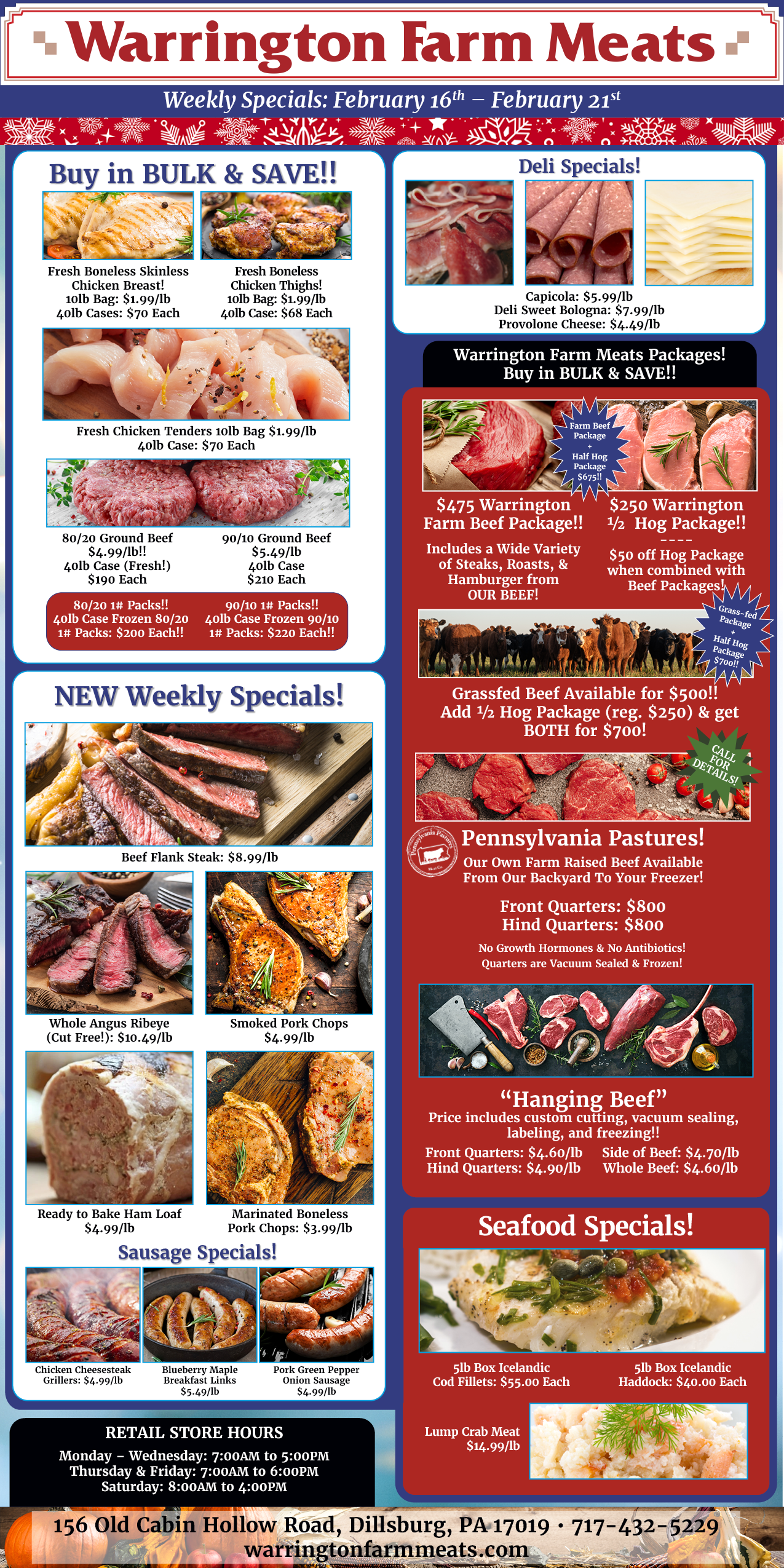 Since then the Jones’s have expanded the operation to include their own farm raised beef and custom butchering. Warrington Farm Meats operates as a family owned and operated business, USDA Inspected Plant, wholesale distributor, retail store, delicatessen, and custom butcher.